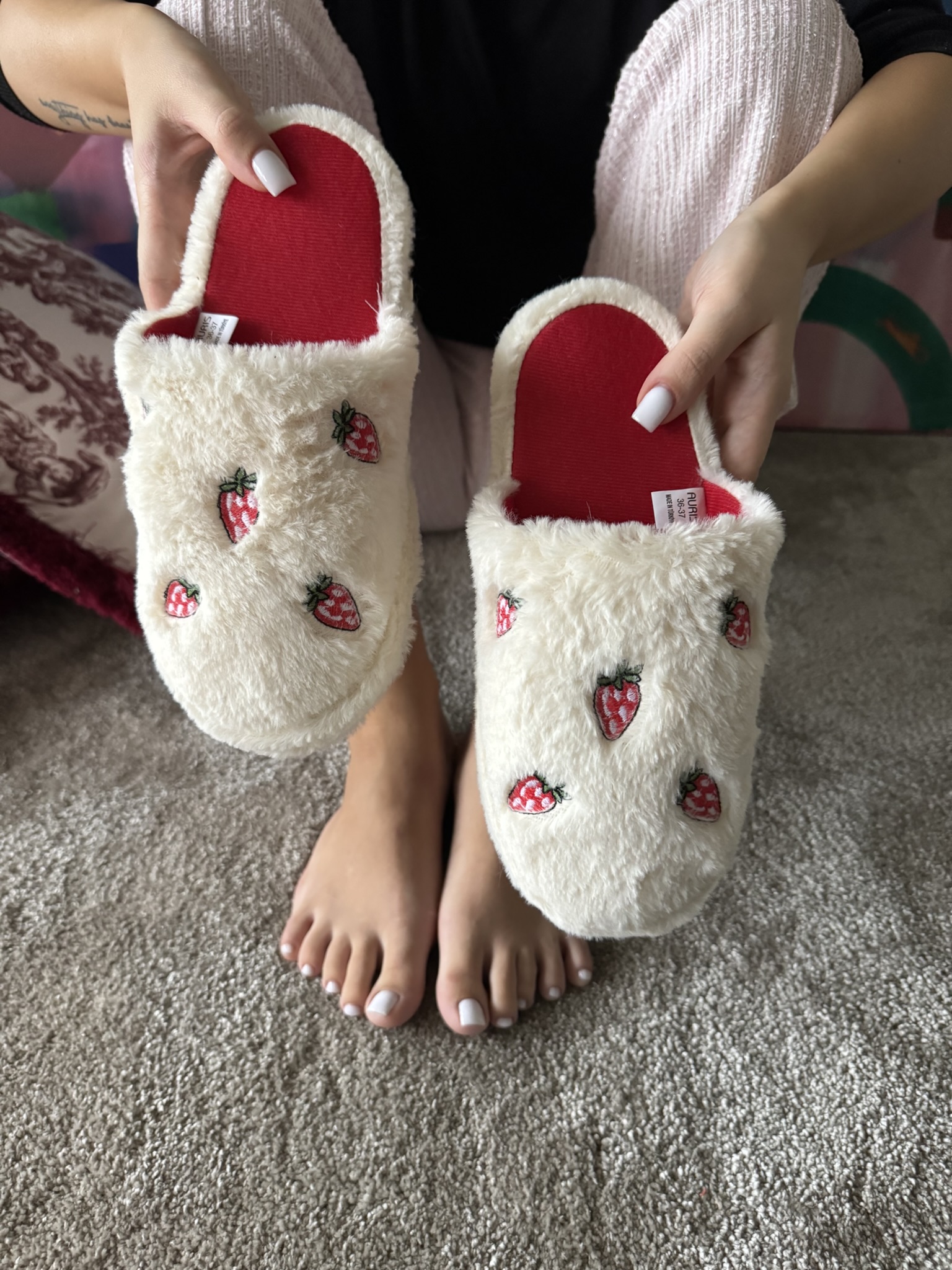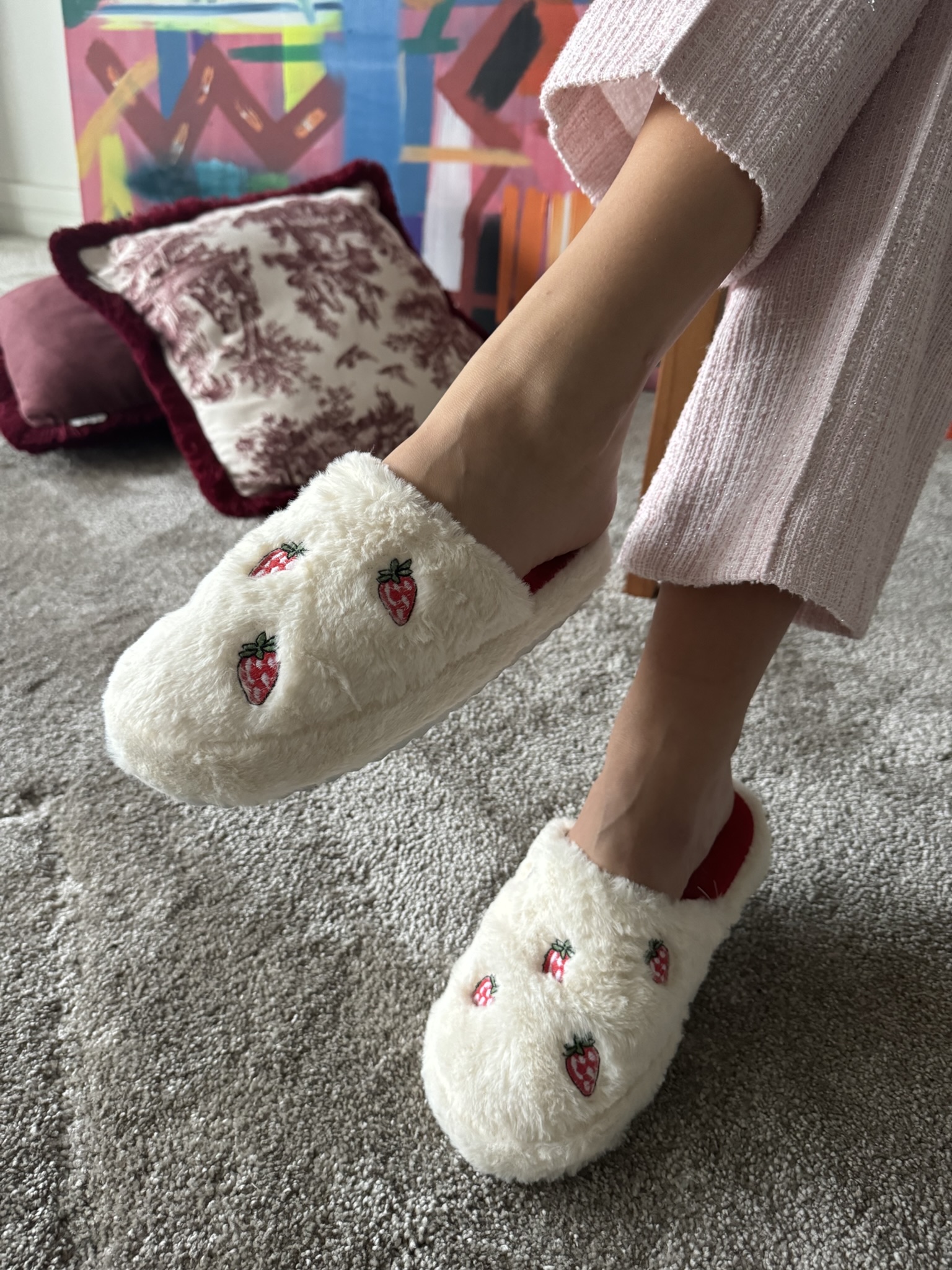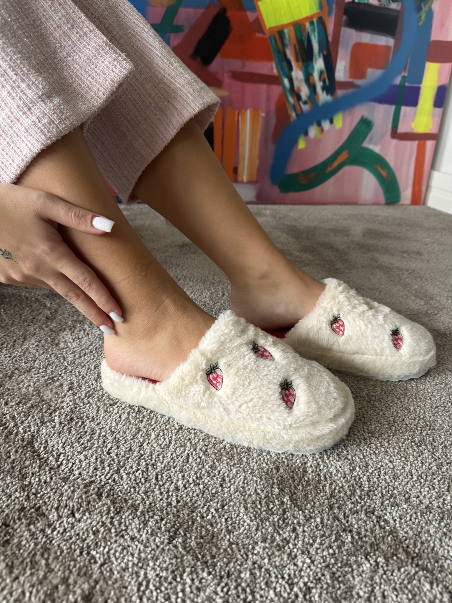Kadın Sessiz Taban Yumuşak ve Hafif Çilek Desen Peluş Ev Terliği